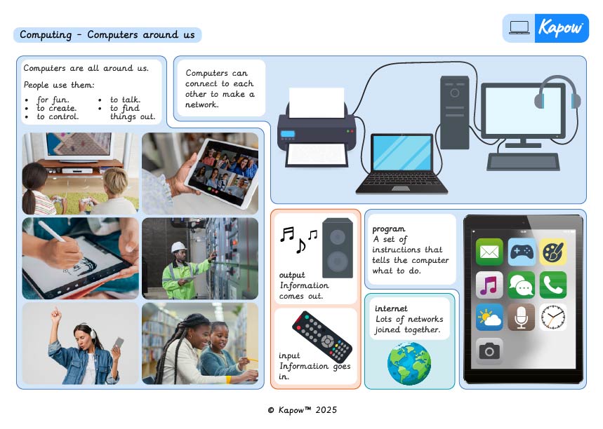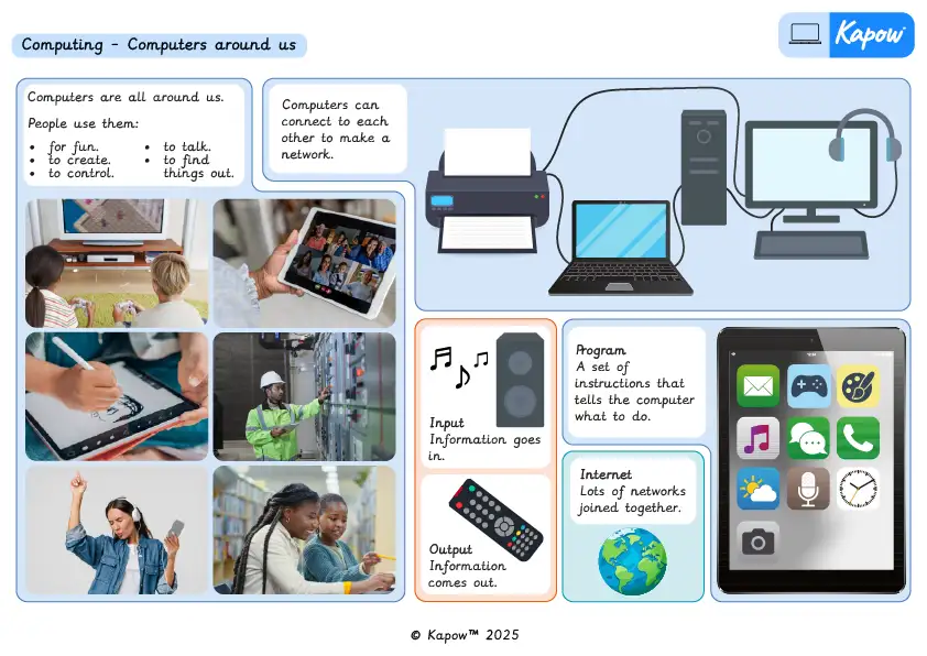Aimed at learners, a single page providing key facts, diagrams and definitions from the Stage 1 unit Computers around us.